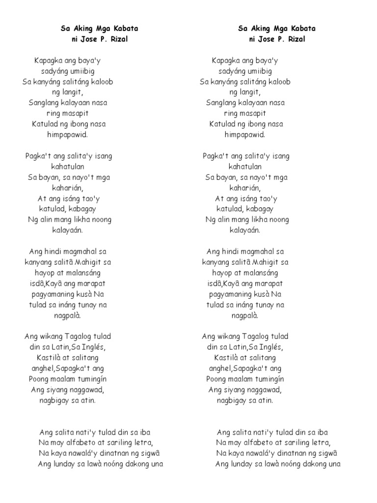 Sa Aking Mga Kabatà is a poem about the love of ones native language written in Tagalog. Sa langit salitang kaloob ng. Katulad ng ibong nasa himpapawid.