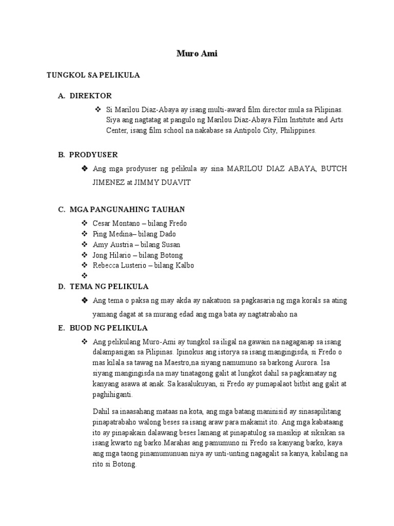 Pamagat Muro Ami 2. Layunin ng pelikula na maipakita ang buhay ni fredo at bigyang leksyon ito at maging ang manunuod. PAGSUSURI NG PELIKULA MURO AMI Gabay sa Pagsusuri.