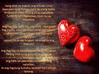 Ang natutunan namin sa tulang ito ay kung paano ang puso kaya magtiis ng hirap maglabas ng damdamin at masanay sa kalungkutan at sakit. Filipino 28102019 1728 jasminsexy. Tayong lahat ay anak ng Diyos at kahit ano man.