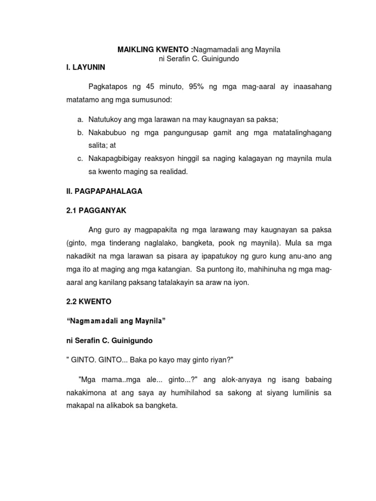 See more of Mga Sipi ng Kwento sa Filipino Grade 9 on Facebook. Batay sa akda na nagmamadali ang maynila ang pamumuhay doon ay karamihan ay walang puhunan at mga mamimili na hindi kanilang pag mamayariAng kilos doon ay lahat mabilis ang kanilang transaksyon yung tipong hindi na kailangan ng mga dokyumento na nagpapatunay na ipinagbibili na ang mga bayagKaramihan sa mga ito ay ganoon ang mga. Sambot ng isang lalaki na ang kausap ay ang kaakbay.